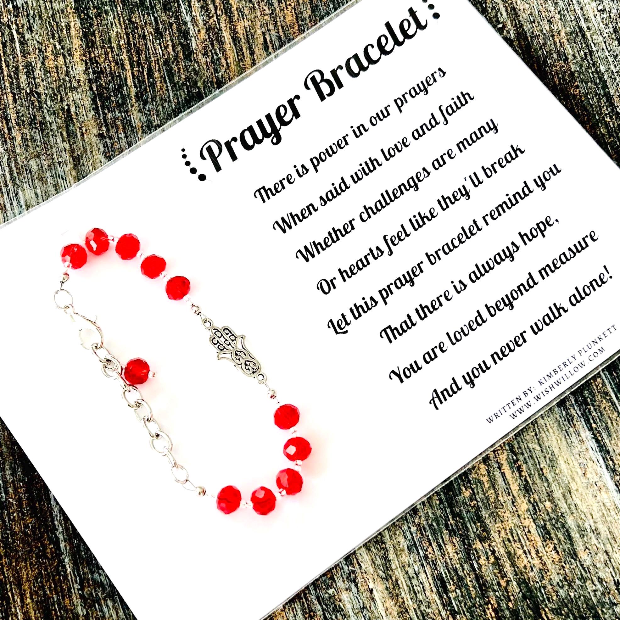 This prayer bracelet would make a perfect gift! It’s meant to offer encouragement & be a reminder of the power of prayer ❤️ It features glass beads, and is adjustable in length from 7” to 8.5”. It will arrive, tied to a 5” x 7” card with our original poem printed on it, tucked inside a clear cello sleeve. A blank card is also included inside, to offer space to write a personal message. You will receive the exact bracelet that is shown in the photos.