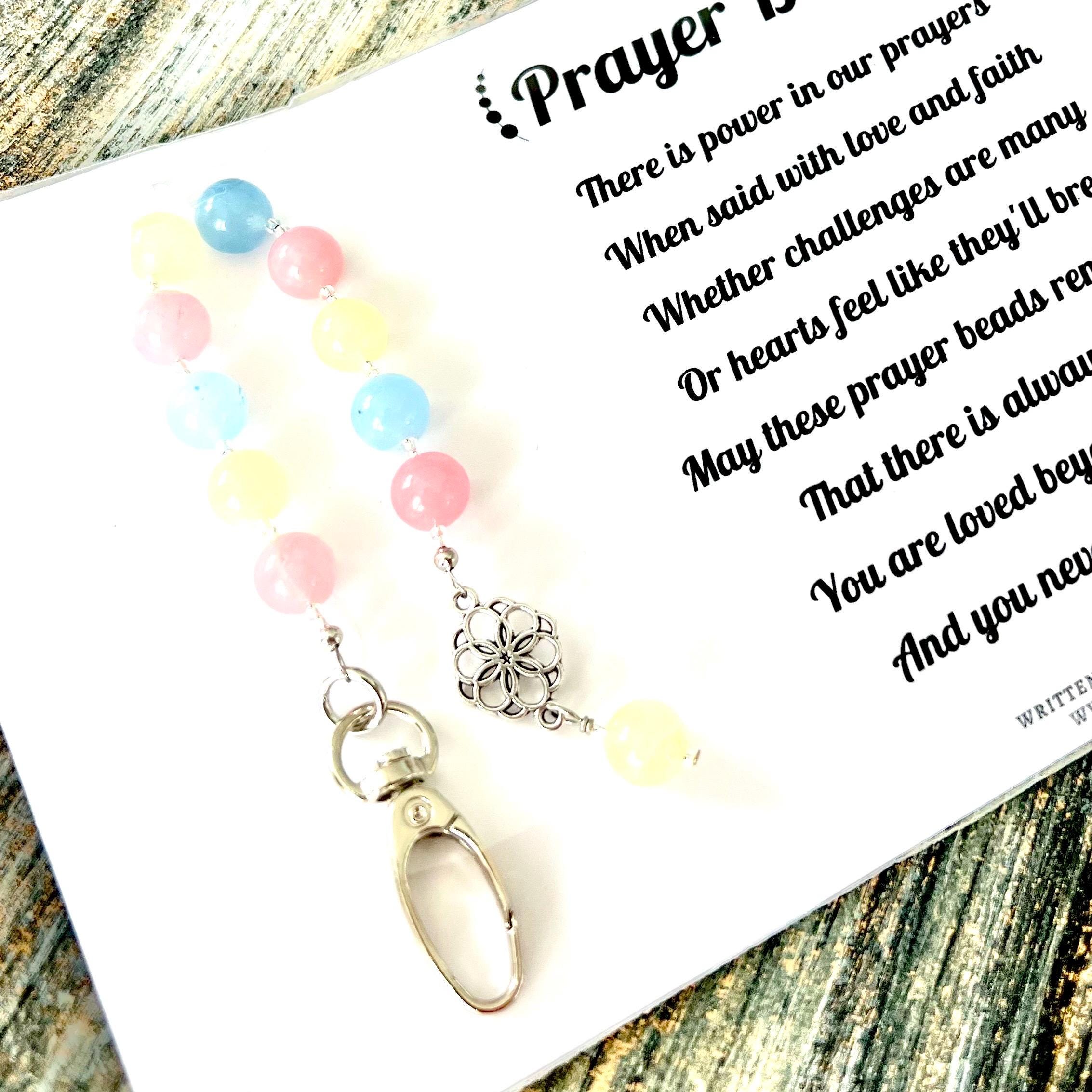 These prayer beads will make a perfect gift! They are meant to offer encouragement & be a reminder of the power of prayer ❤️ They feature glass beads, and an oval shaped clip (clip may be attached to a key ring, purse, spiral notebook, backpack, etc.). They will arrive, tied to a 5” x 7” card with our original poem printed on it, and tucked inside a clear cello sleeve. A blank card is also included inside, to offer space to write a personal message.