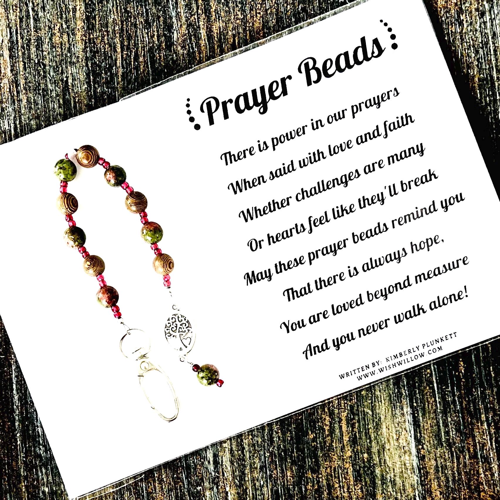 These prayer beads will make a perfect gift! They are meant to offer encouragement & be a reminder of the power of prayer ❤️ They feature stone, wood & glass beads, with an oval shaped clip (clip may be attached to a key ring, purse, spiral notebook, backpack, etc.). They will arrive, tied to a 5” x 7” card with our original poem printed on it, and tucked inside a clear cello sleeve. A blank card is also included inside, to offer space to write a personal message.