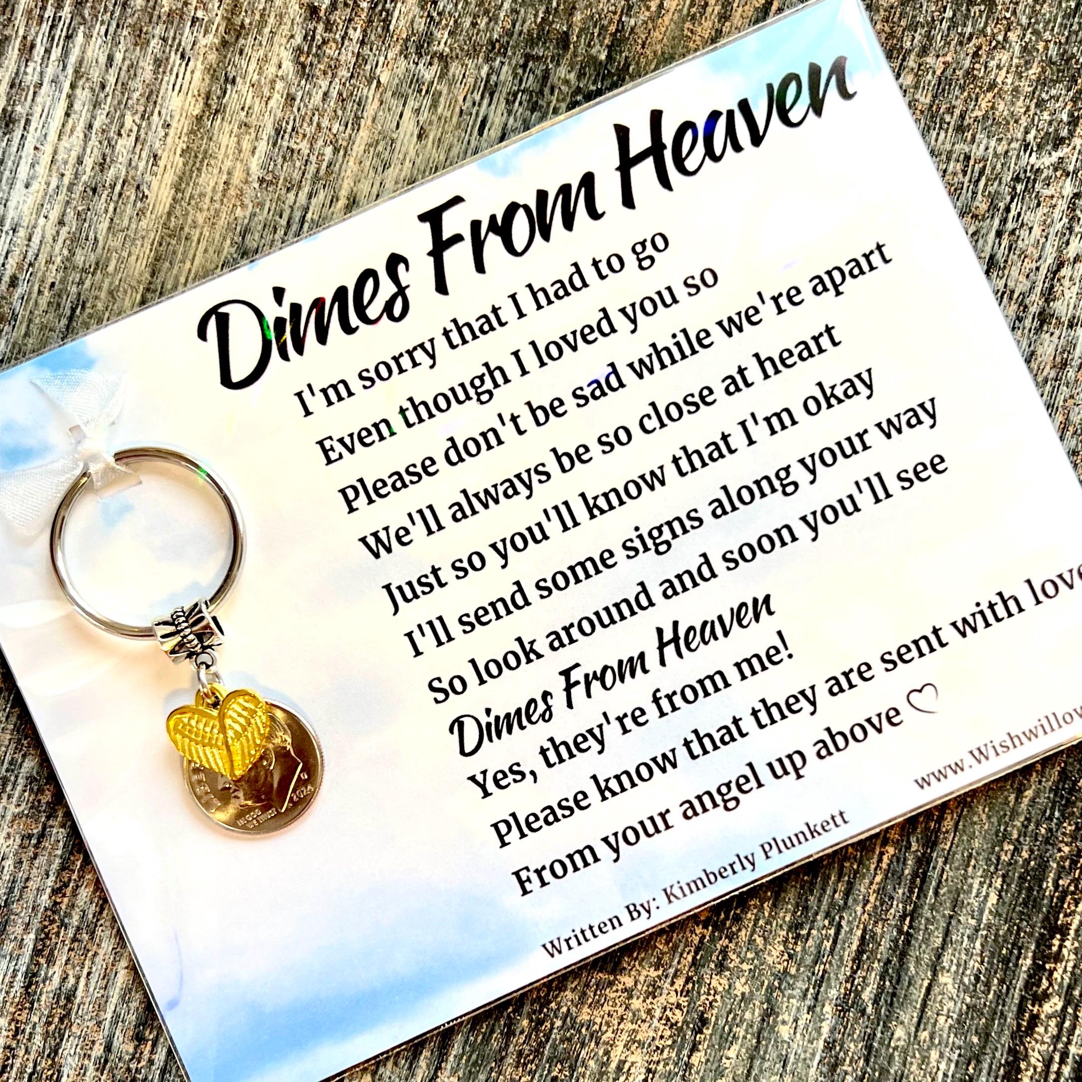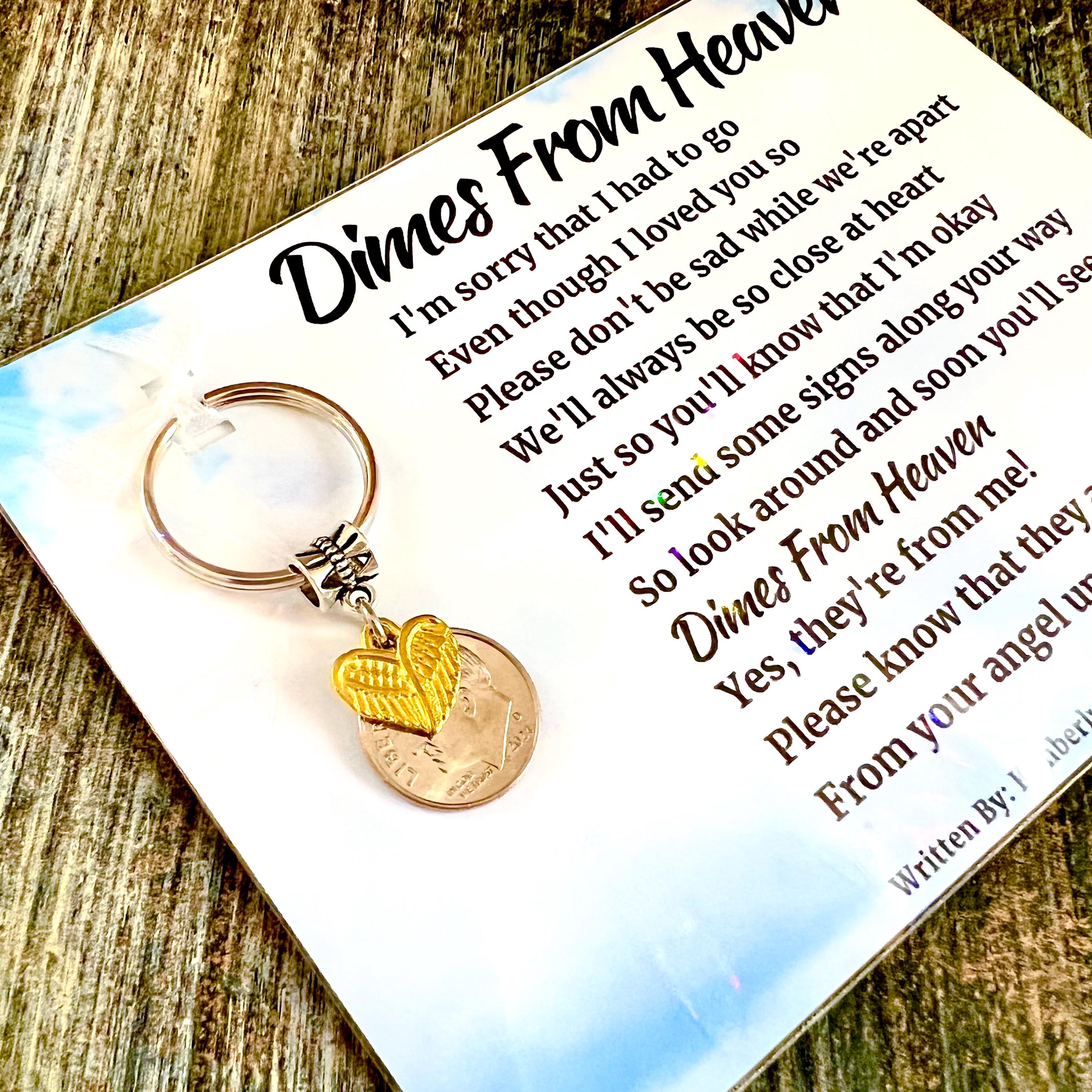 A beautiful golden angel wing heart is featured, along with a handmade dime charm, on this keychain. (The dime charm has a silver heart on it's reverse, which reads, "Made with Love".) It is attached to a card, printed with our own original poem. The keychain is a great reminder that our loved ones are always close at heart, and that we should look for signs of their love, as we go through our days ♡ It will arrive in a cello bag, and makes a perfect little gift.