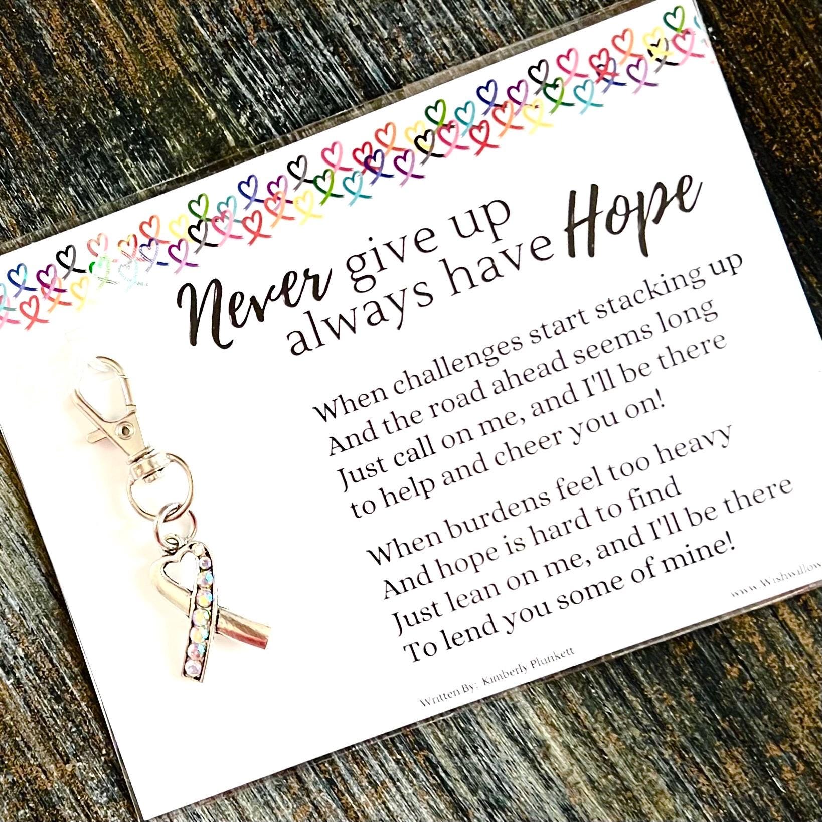 The card is approximately 4" tall, and 5" wide. It features our original poem, and colorful heart hope ribbon design at the top.