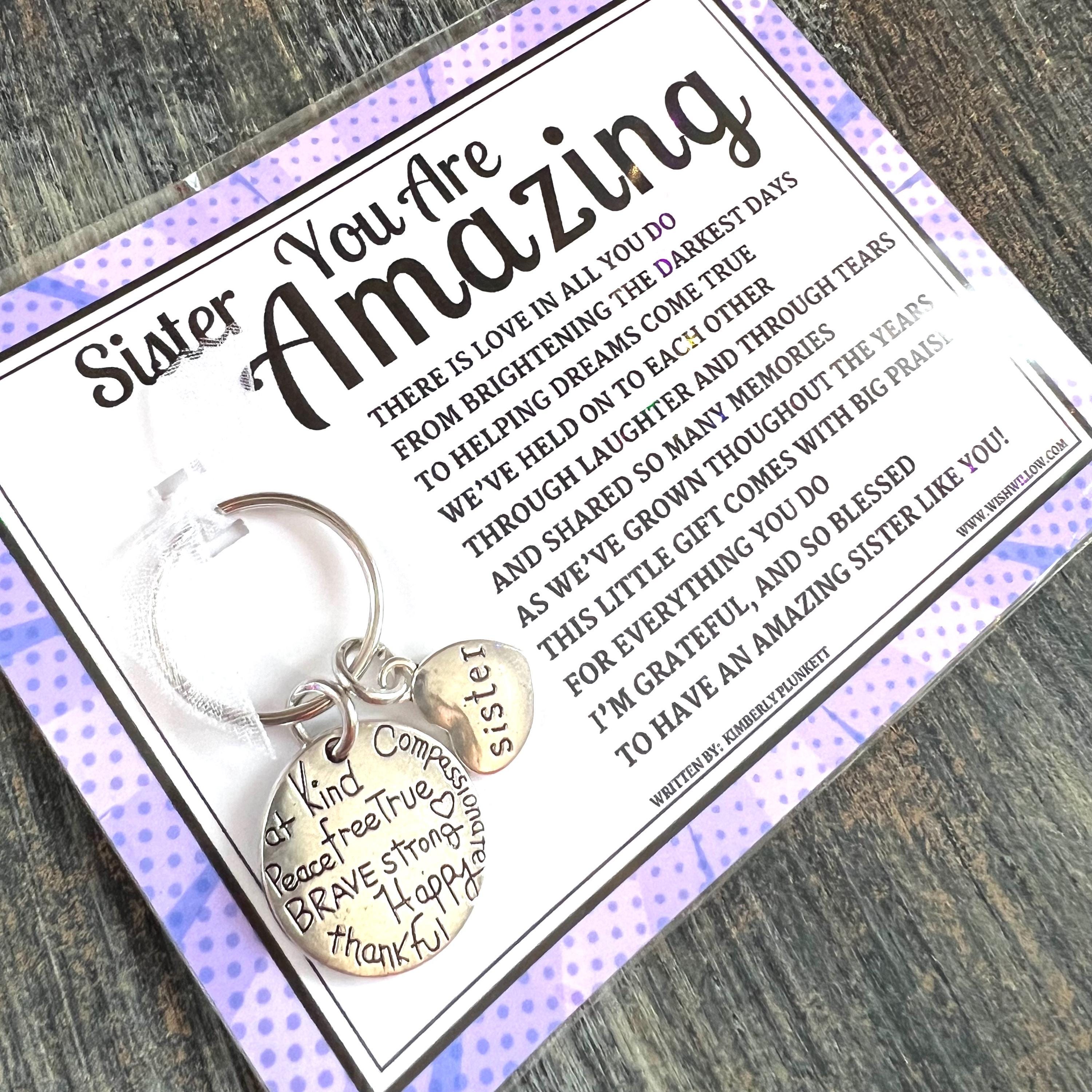 A great little gift, for an AMAZING sister! Includes flat card, with original poem & keychain (as shown). Card is approximately 4” x 5” in size, and will come inside a cello sleeve.