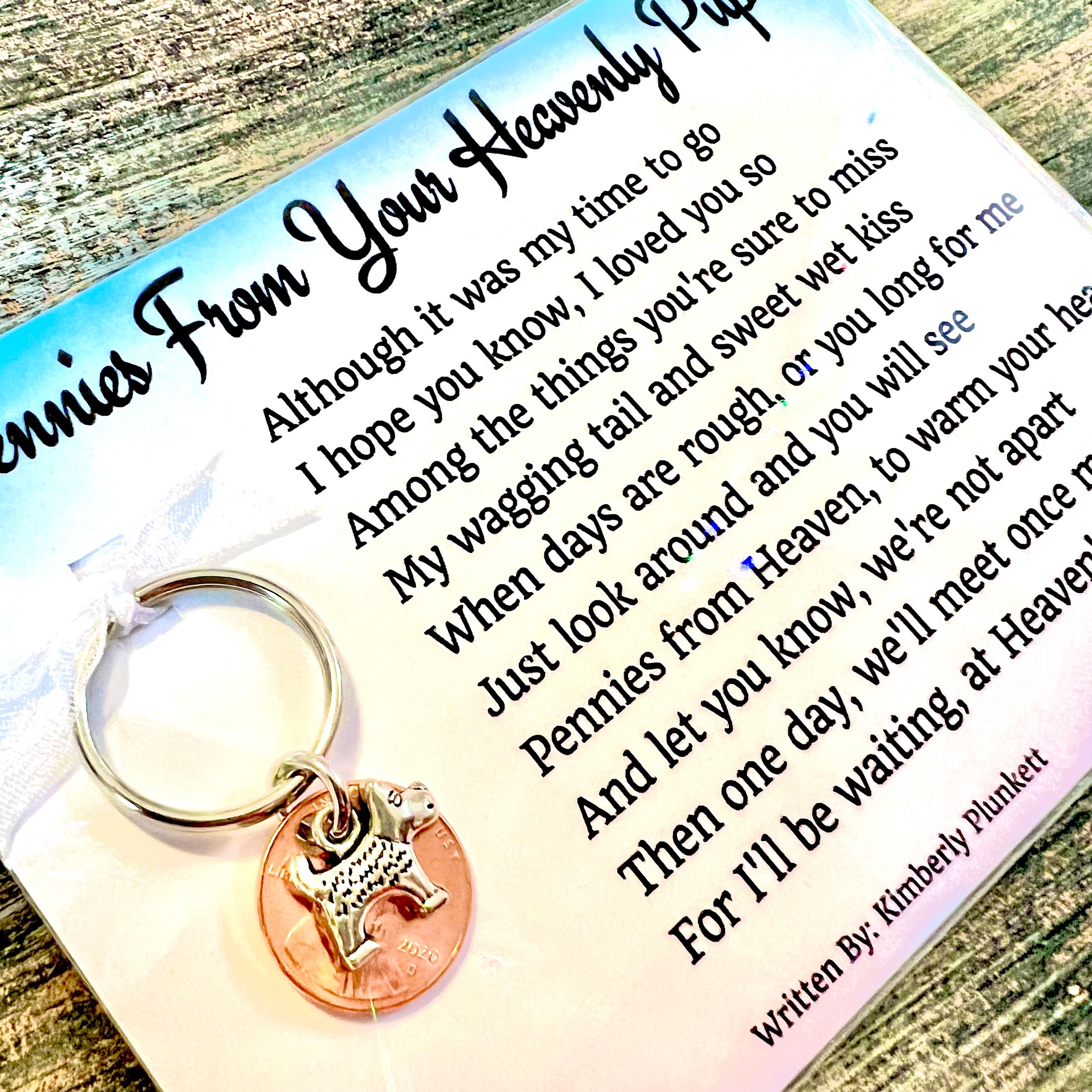 A sweet little dog charm is featured, along with a penny, on this keychain. It is attached to a card, printed with our own original poem. The keychain is a great reminder that our beloved pets are always close at heart, and that we should look for signs of their love, as we go through our days ♡ It will arrive in a cello bag, and makes a perfect little gift.