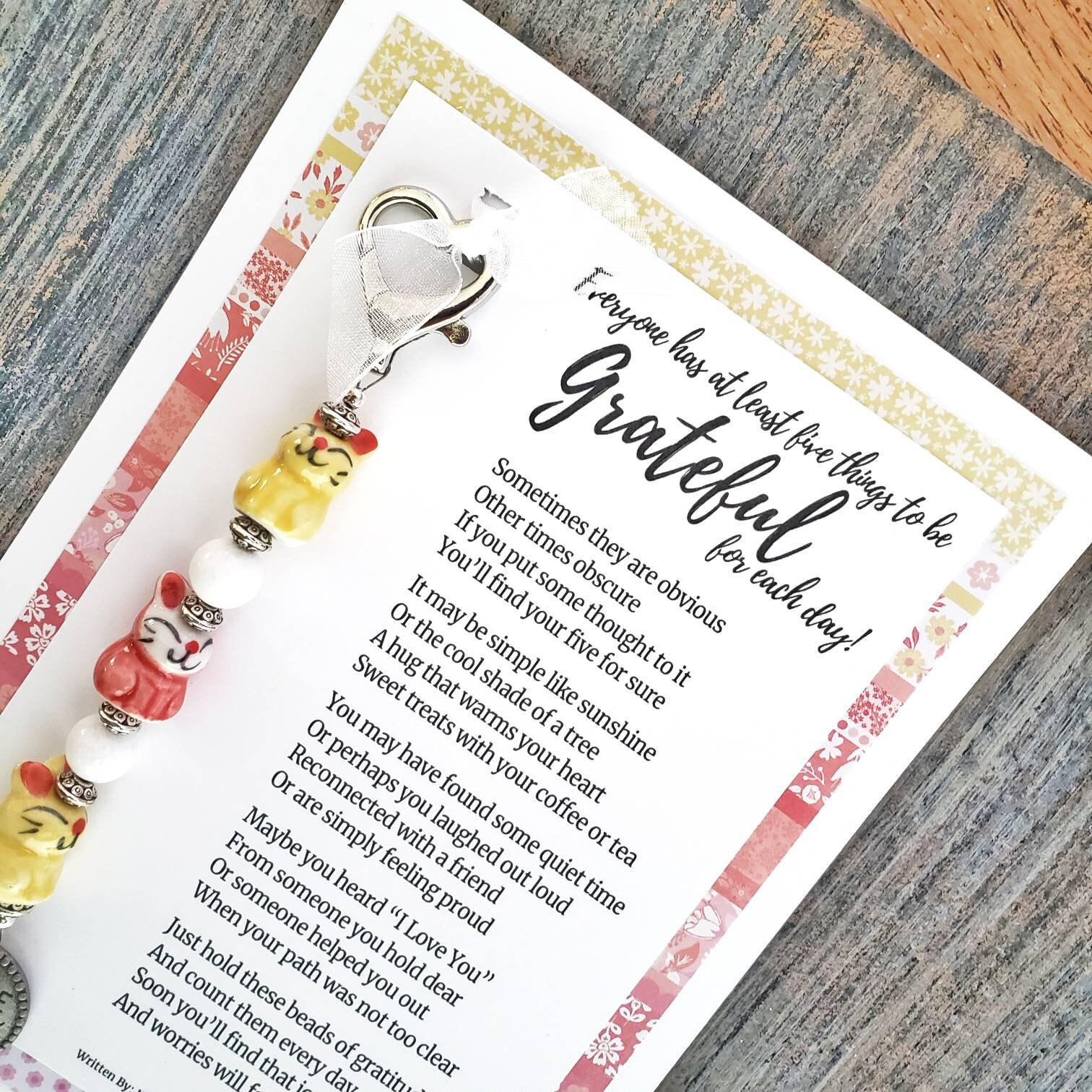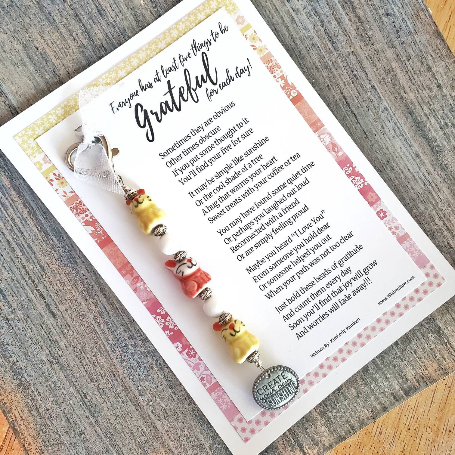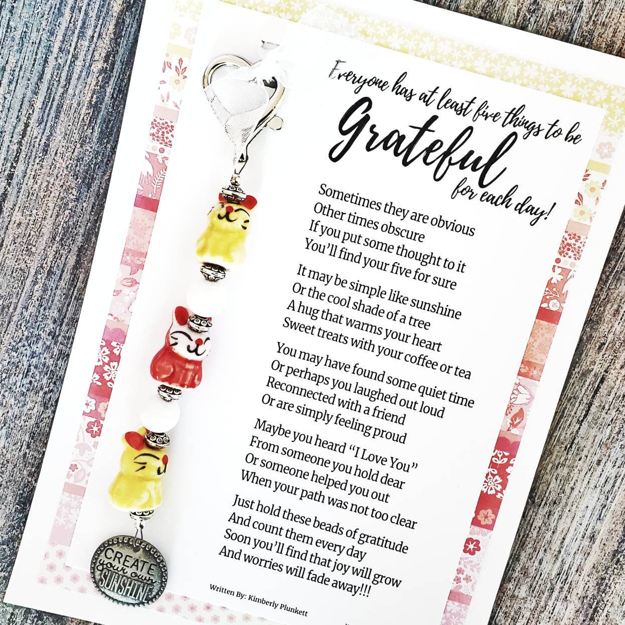 Our original poem & design... These gratitude beads are simply a reminder to be thankful for all the blessings in life ❤ The five large beads are used to count your five biggest blessings each day, and the spacers can be used to count the little things too! They are handmade with love, and are meant to bring cheer wherever you go. The clasp hangs nicely from most purses or backpacks, and is suitable to attach to a spiral binding on a notebook or journal as well (where you could write down your daily five). When you start to take note of all the good things in life, many more are sure to come your way!