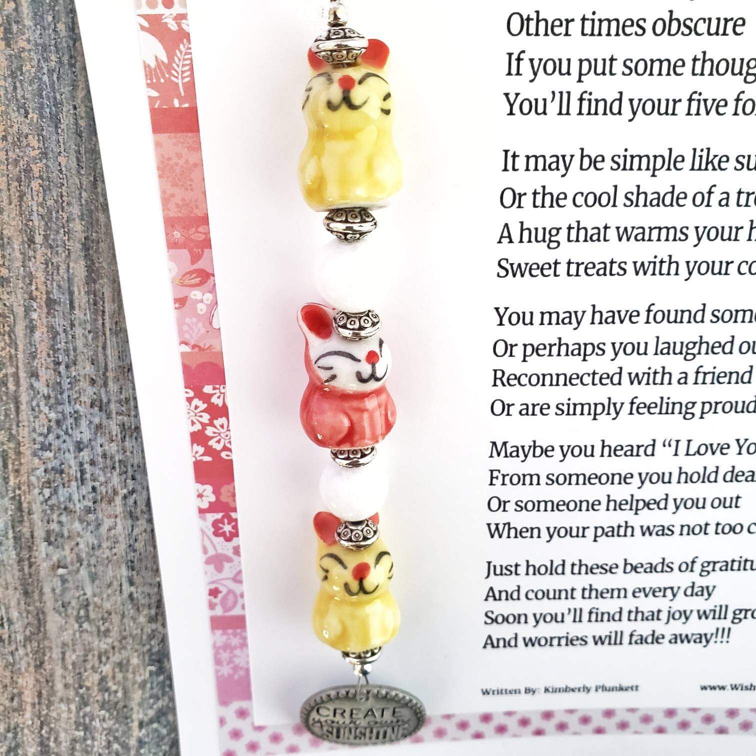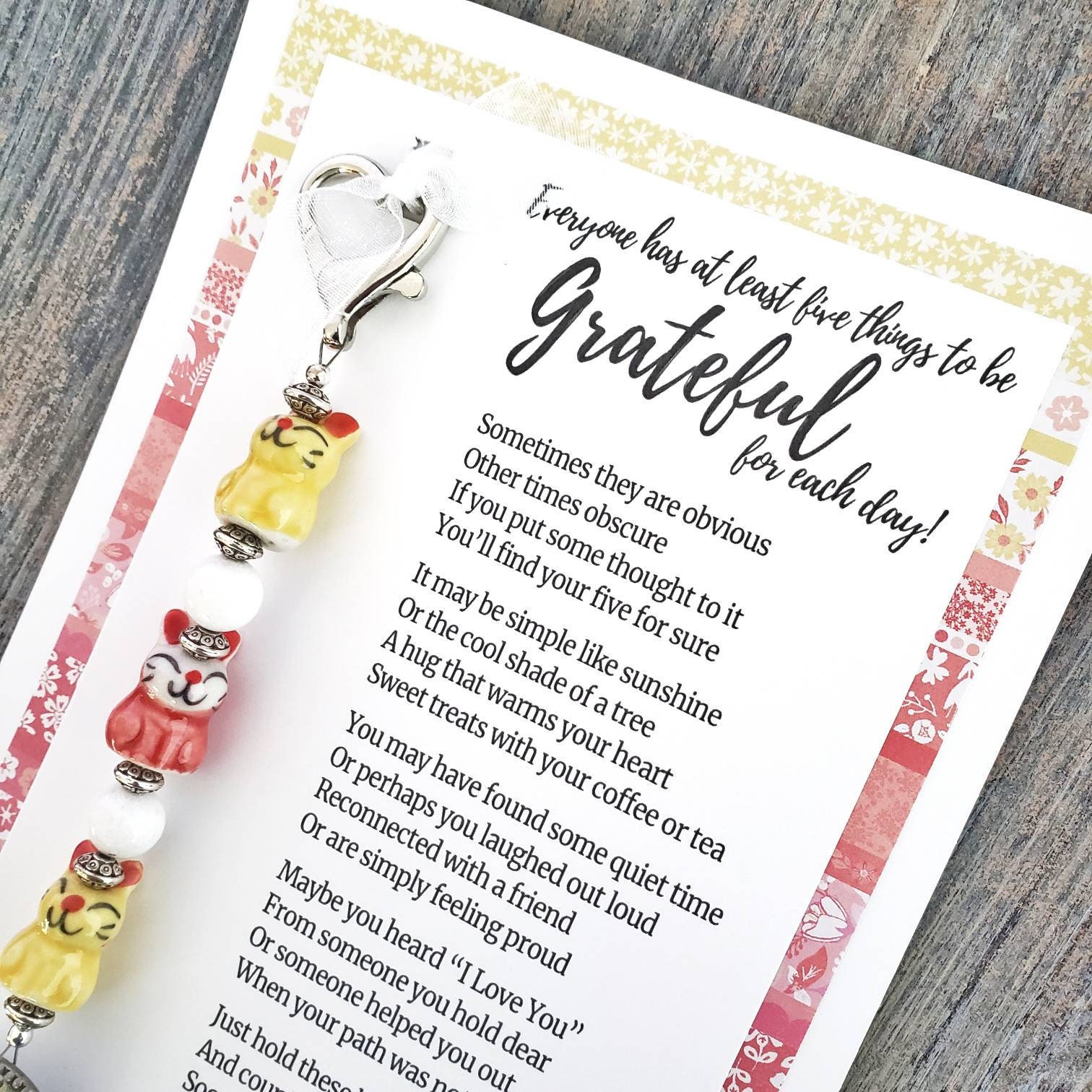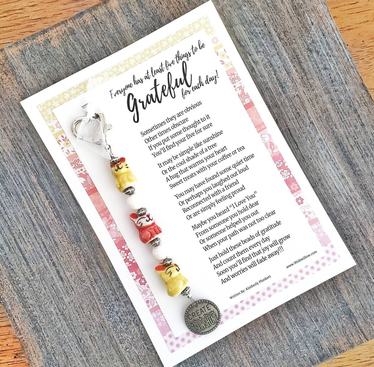 Our original poem & design... These gratitude beads are simply a reminder to be thankful for all the blessings in life ❤ The five large beads are used to count your five biggest blessings each day, and the spacers can be used to count the little things too! They are handmade with love, and are meant to bring cheer wherever you go. The clasp hangs nicely from most purses or backpacks, and is suitable to attach to a spiral binding on a notebook or journal as well (where you could write down your daily five). When you start to take note of all the good things in life, many more are sure to come your way!
