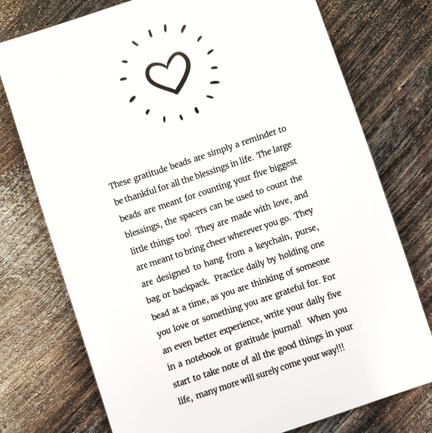 The first photos show the front of the card, with the gratitude beads attached by an organza ribbon. The last photo shows the back of the card, printed with a description/instructions.