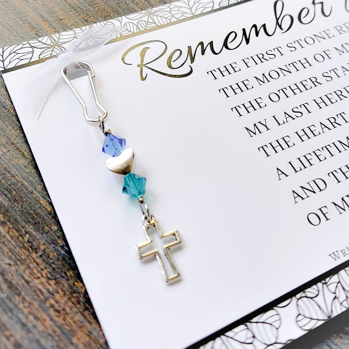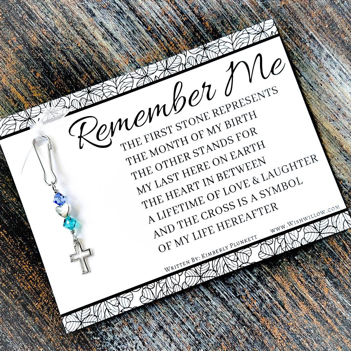 This memorial gift is unique to Plunkett Designs. It features our original poem, along with a custom handmade charm. The charm is made with genuine Swarovski crystals and is approximately 3" in length, including the hook (a nice size to hang from a zipper, purse, backpack or keychain).
