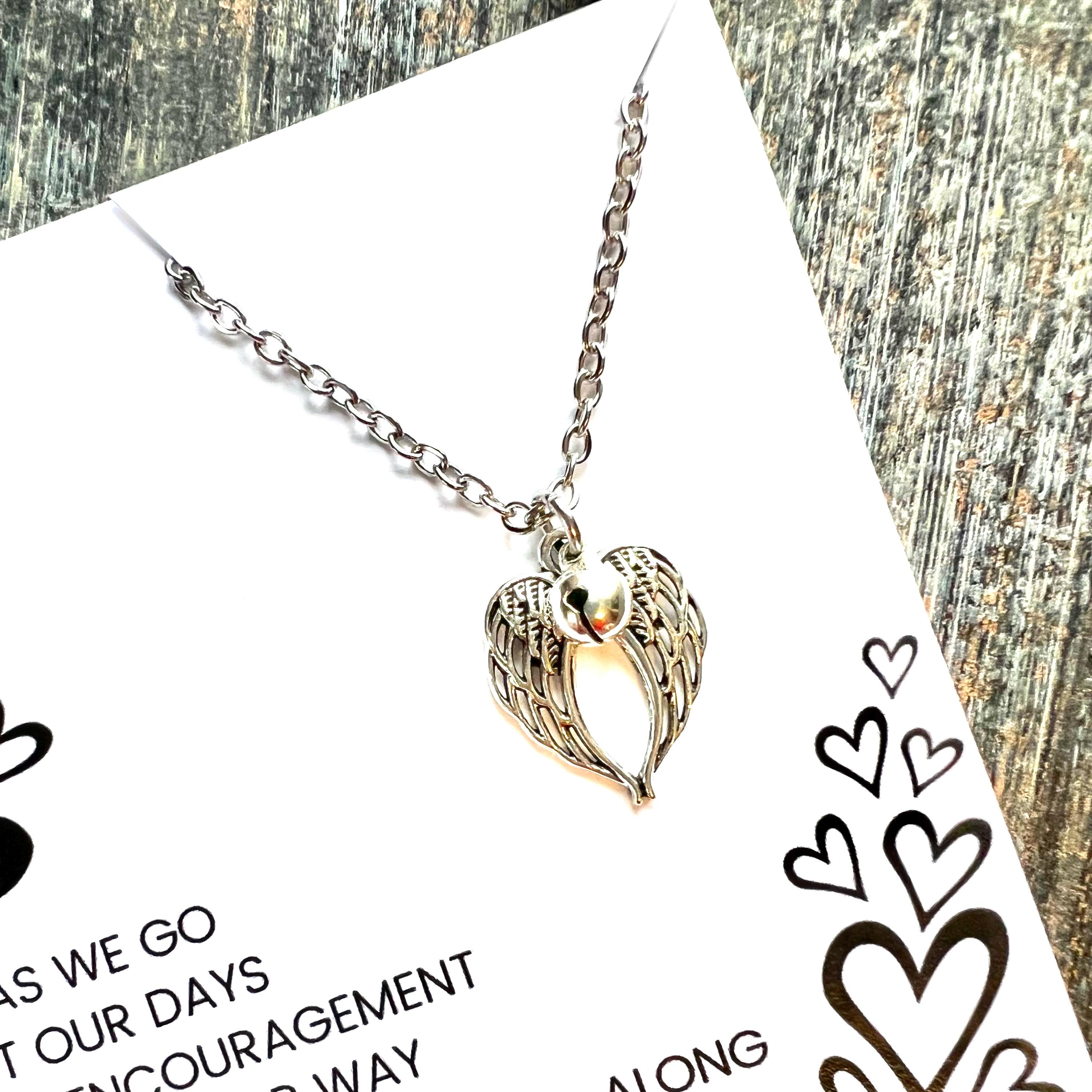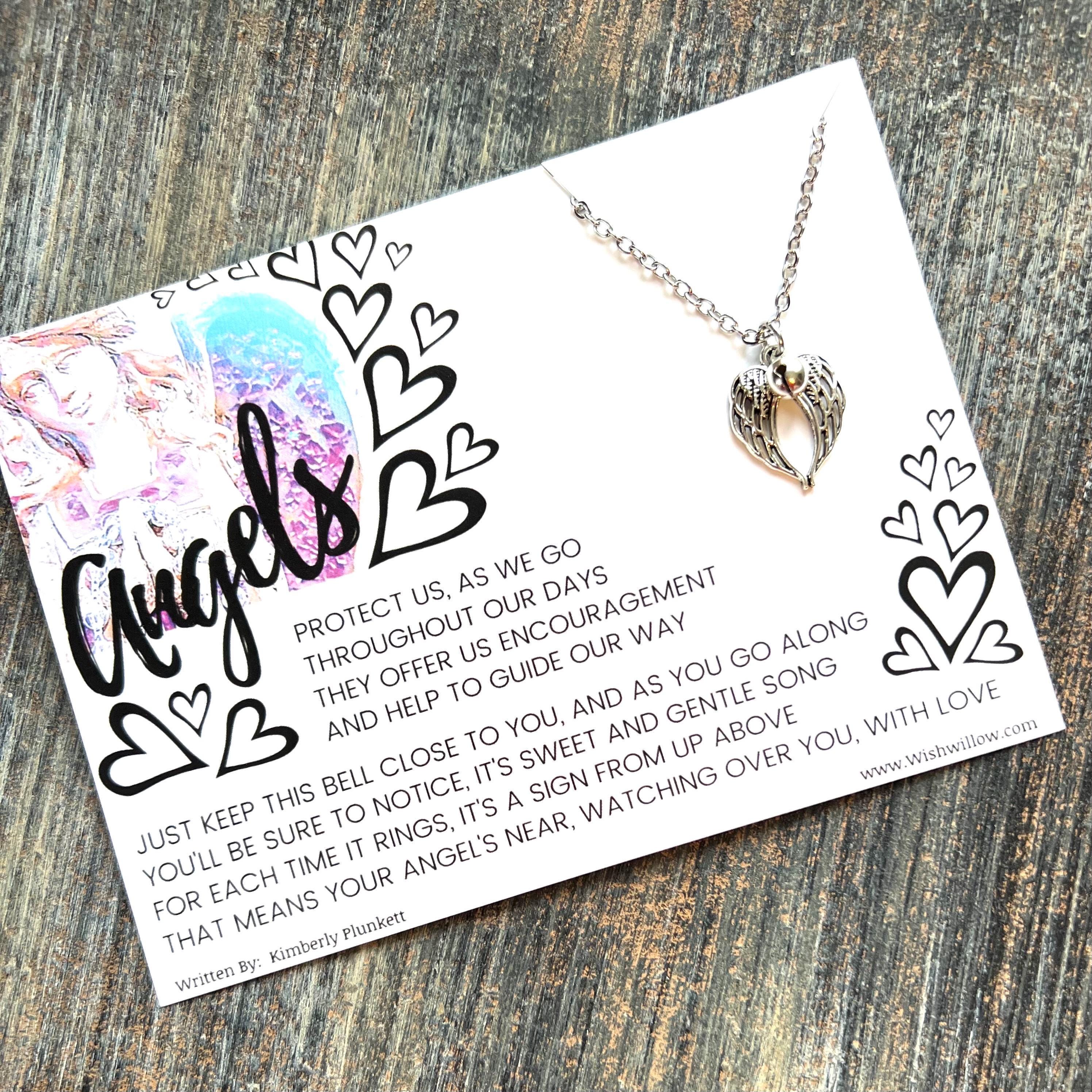 The necklace features a heart shaped angel wings charm, along with a mini jingle bell. The chain is stainless steel, 18" in length, and has a lobster clasp closure.